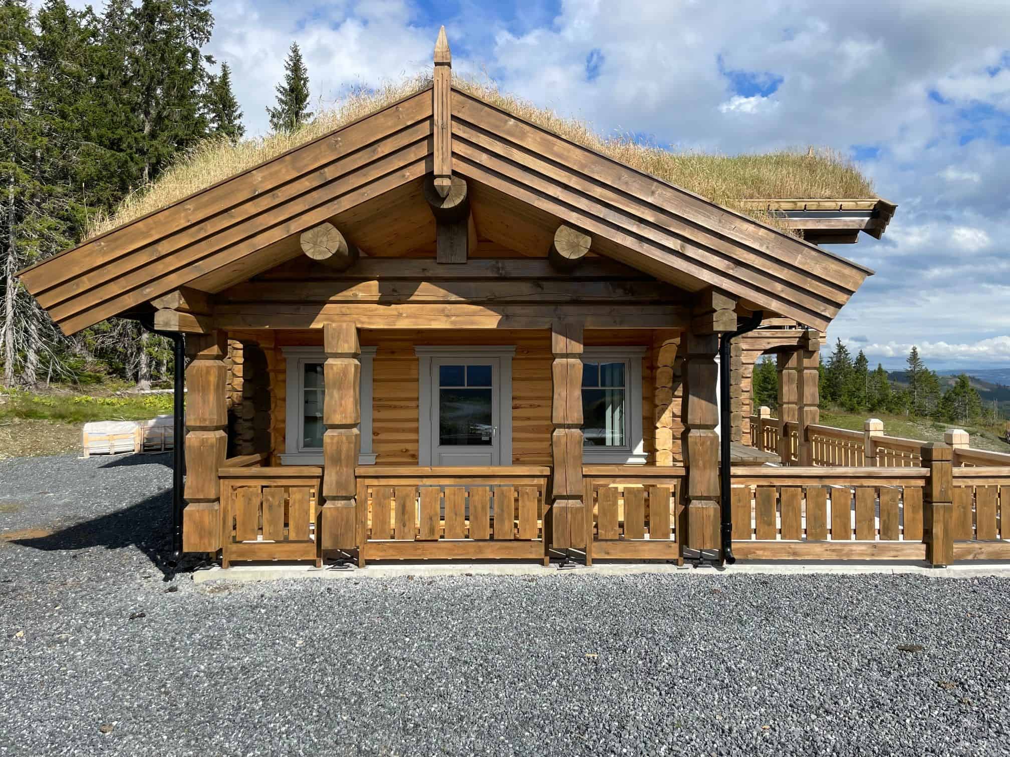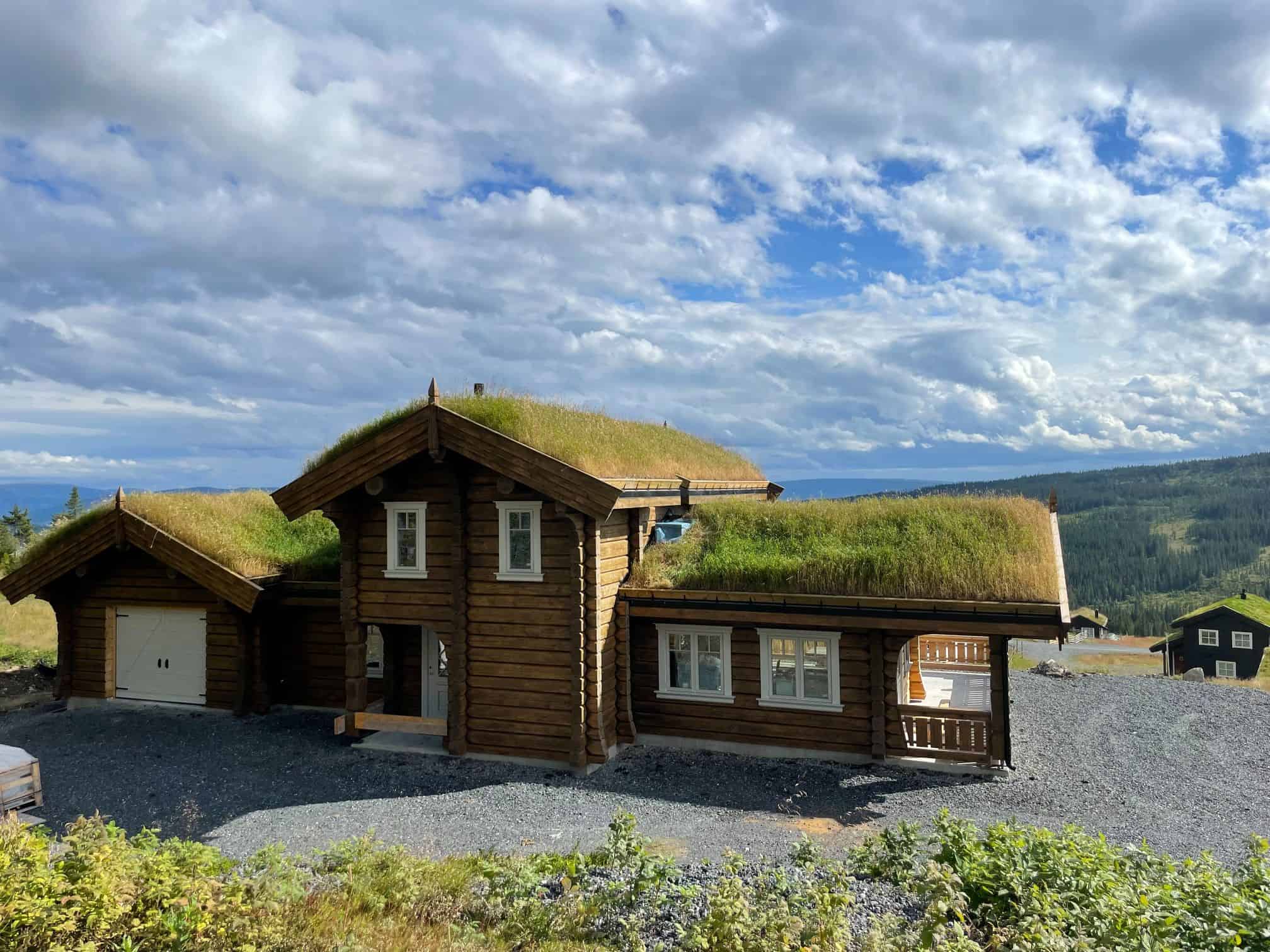 Hytte i 8 tomms tømmer med integrert garasje. Vi har utført oppføring, torv, montering peis og flislegging.